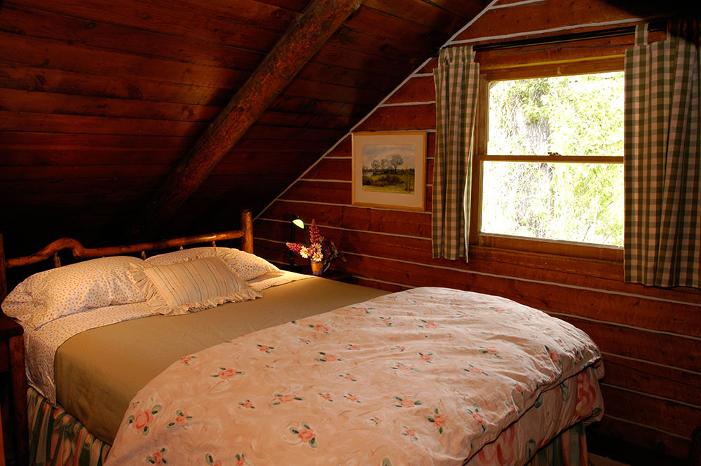 The upstairs is a Loft Bedroom. Although small with limited headroom, the bedroom is quiet and cozy with a Queen size bed. Decorated with rustic western furnishings, and summer cotton percale or winter flannel sheets, down comforter, down pillows & merino wool blankets, this room is "cabiny" & comfy.